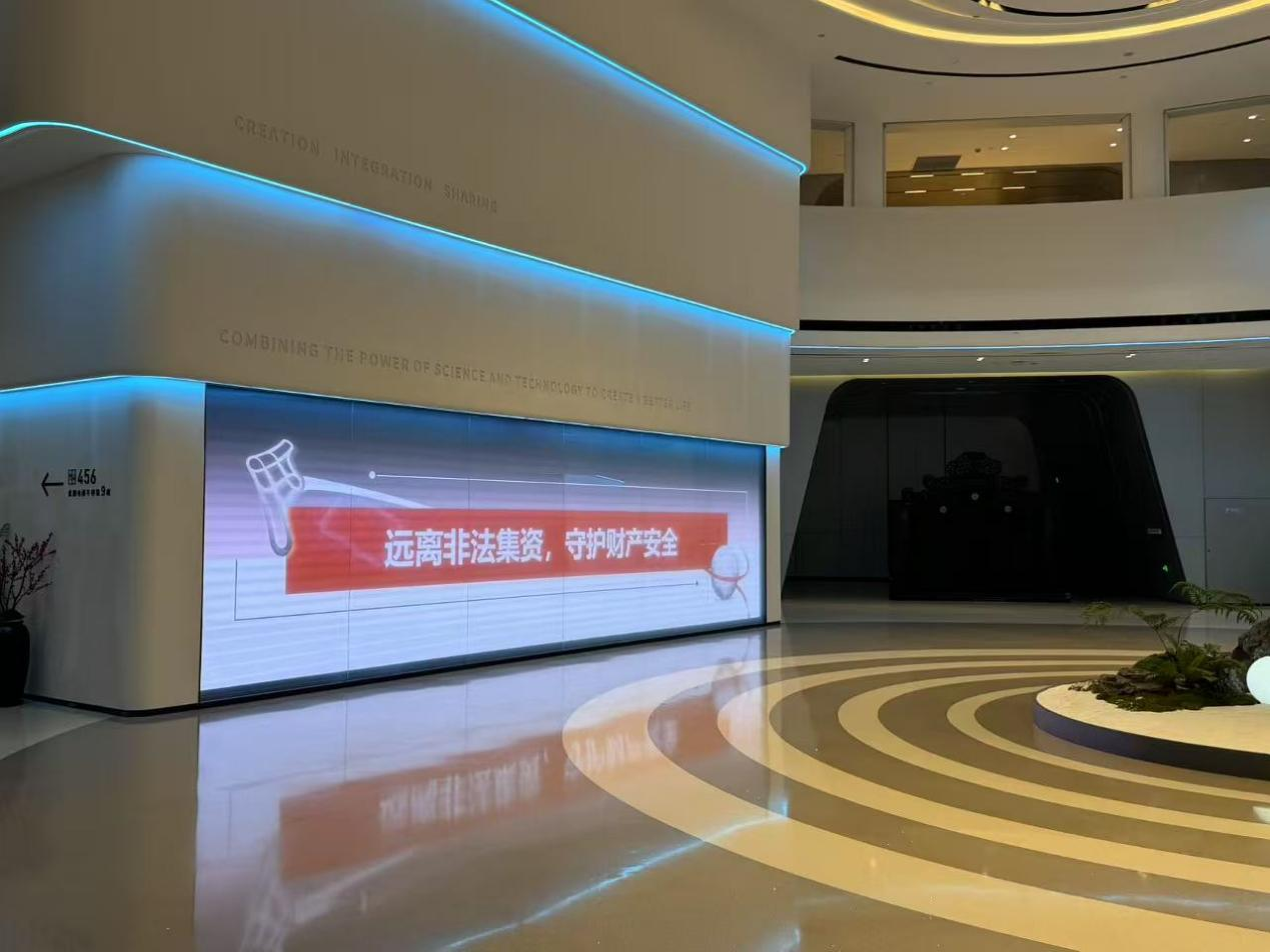 標語警示:公司青山湖園區辦公大樓LED屏滾動播放“遠離非法集資,守護財產安全”“高利誘惑是陷阱,理性投資保平安”等標語,強化警示效果。