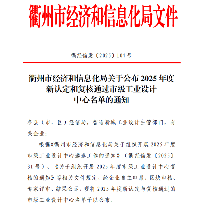 近日,衢州市經濟和信息化局公布了2025年度新認定和復核通過市級工業(yè)設計中心的名單,根據(jù)《衢州市經濟和信息化局關于組織開展2025年度市級工業(yè)設計中心遴選工作的通知》《關于組織開展2025年度市級工業(yè)設計中心復核的通知》等相關文件規(guī)定,經企業(yè)自主申報、區(qū)塊審核、專家評審等一系列流程,浙江海納半導體股份有限公司(以下簡稱“海納股份”)成功通過衢州市2025年度市級工業(yè)設計中心復核。